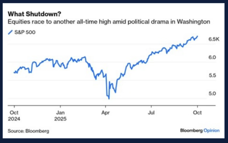 Despite the U.S. government shutdown and potential federal layoffs, the S&P 500 continued to rise during the week, hitting new all-time highs as markets discount near-term fiscal risks.