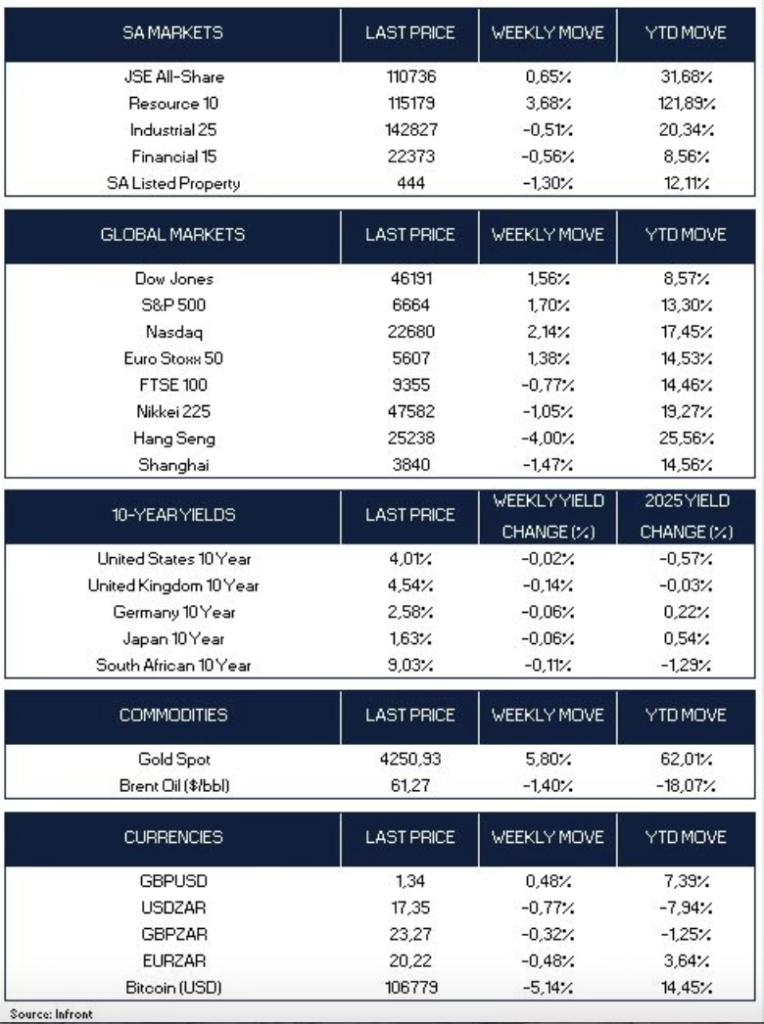 In Asia, Japan’s Nikkei 225 fell 1.05% as yen strength weighed on exporters and investor sentiment remained cautious amid global trade uncertainty, while in China, deflationary pressures persisted. Producer prices fell 2.3% year-on-year in September, while consumer prices declined 0.3%, deeper than expected. However, core inflation rose to a 19-month high of 1.0%, offering a glimmer of resilience in domestic demand. The Shanghai Composite Index fell 1.47% for the week, while Hong Kong’s Hang Seng Index dropped 4%, pressured by escalating trade concerns and weak property sentiment.