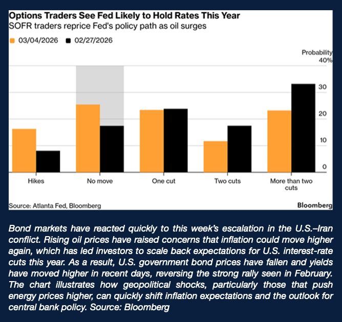 Global markets experienced a volatile week as a combination of geopolitical tensions and economic data created what many investors described as a “perfect storm” in markets. The escalation of the conflict in the Middle East following the United States’ military campaign against Iran pushed oil prices sharply higher, raising concerns about renewed inflation pressures at a time when global growth signals are becoming more mixed. Brent crude surged more than 30% during the week amid fears of potential supply disruptions, particularly as the Strait of Hormuz - through which roughly a fifth of global oil supply passes - faces potential disruption. Higher energy prices have historically been a challenge for both economies and financial markets, as they tend to lift inflation while simultaneously weighing on growth, a combination often referred to as stagflation.